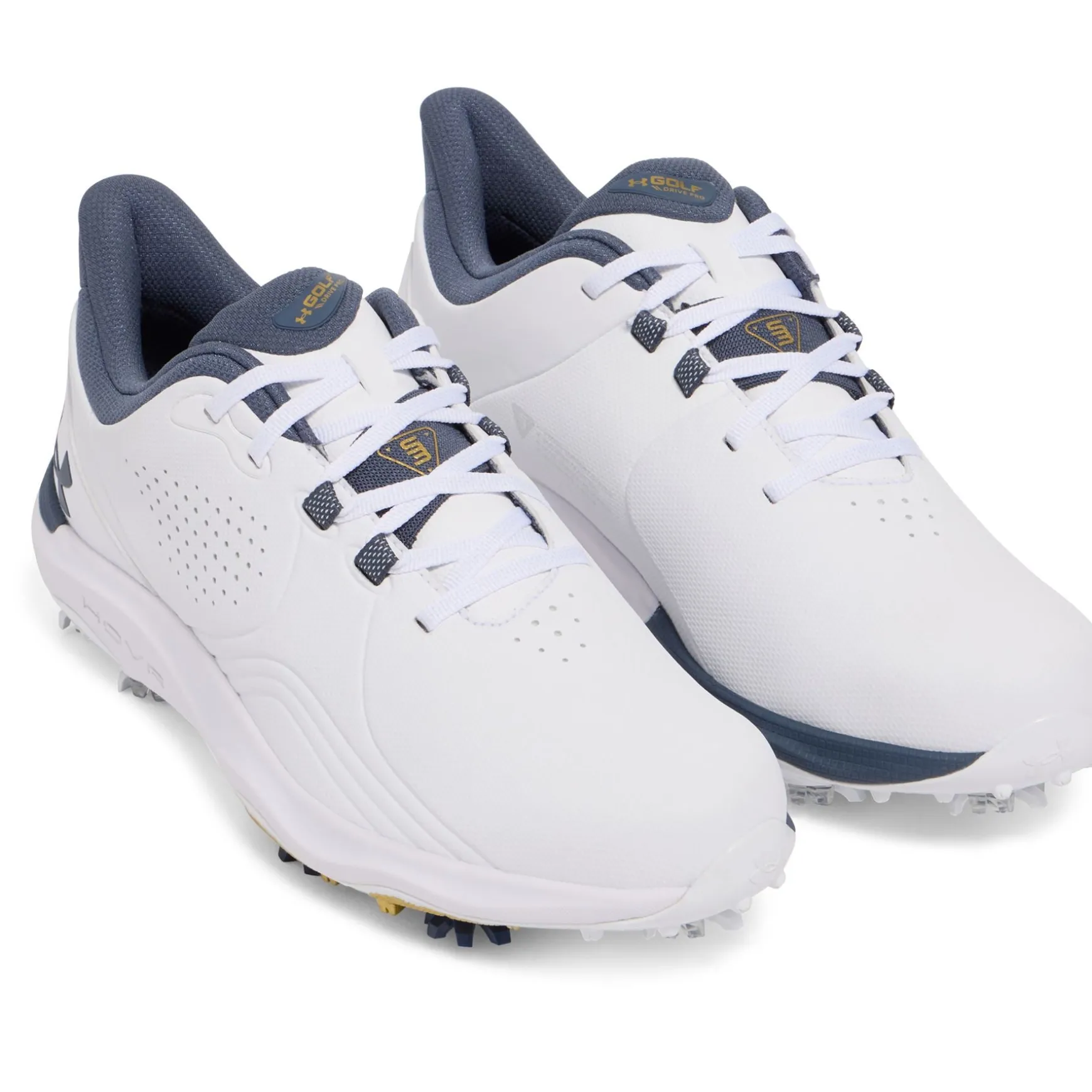 The Drive Pro Wide Golf Shoes in White/Metallic Gold/Downpour Grey are expertly designed to enhance your performance on the course, offering superior traction, cushioning, and biomechanical support. Built specifically for wide feet, these shoes feature advanced UA Swing Support System (S3) technology, responsive cushioning, and water-resistant construction to ensure comfort and stability throughout your round. With a sleek design and premium materials, they bring both style and function to your game.