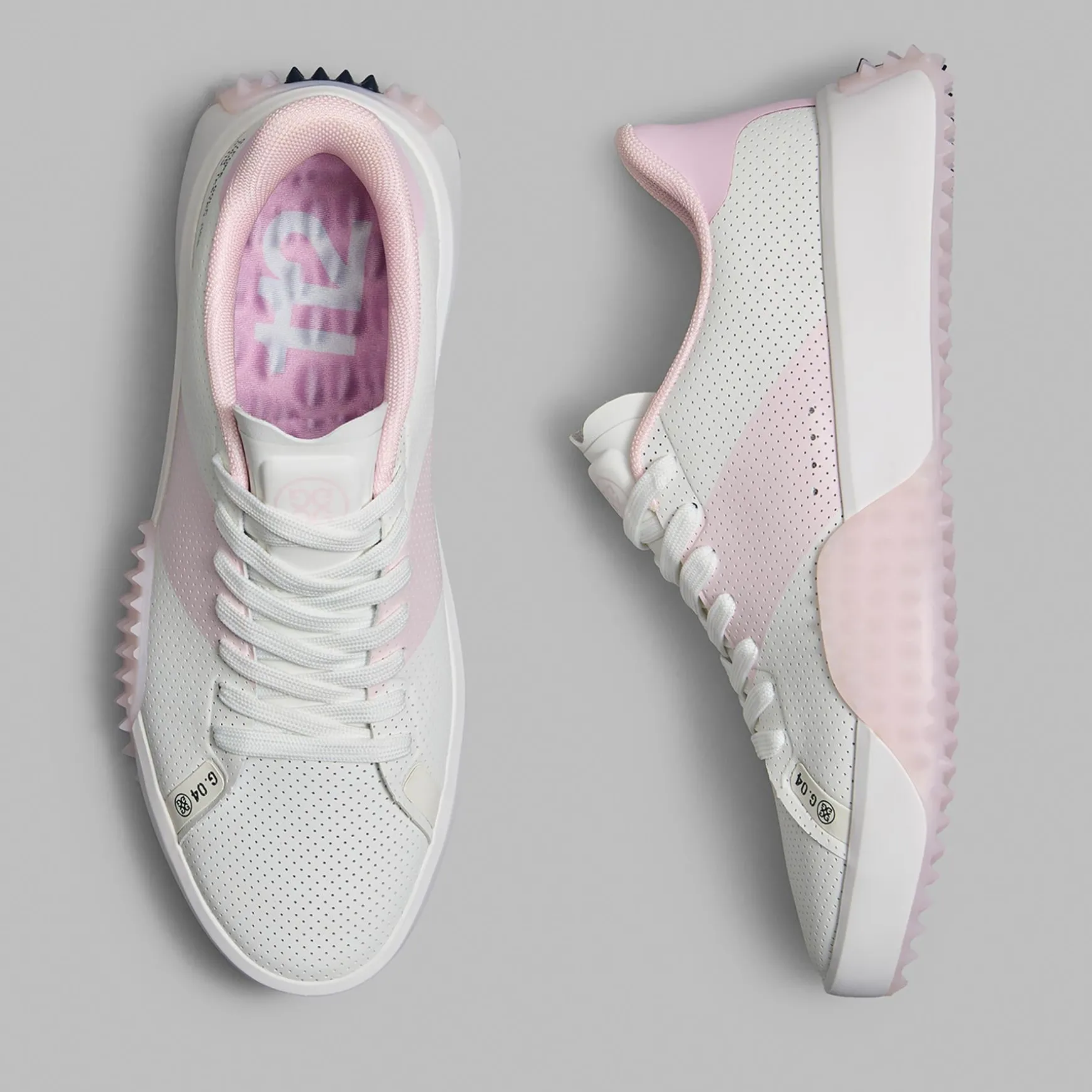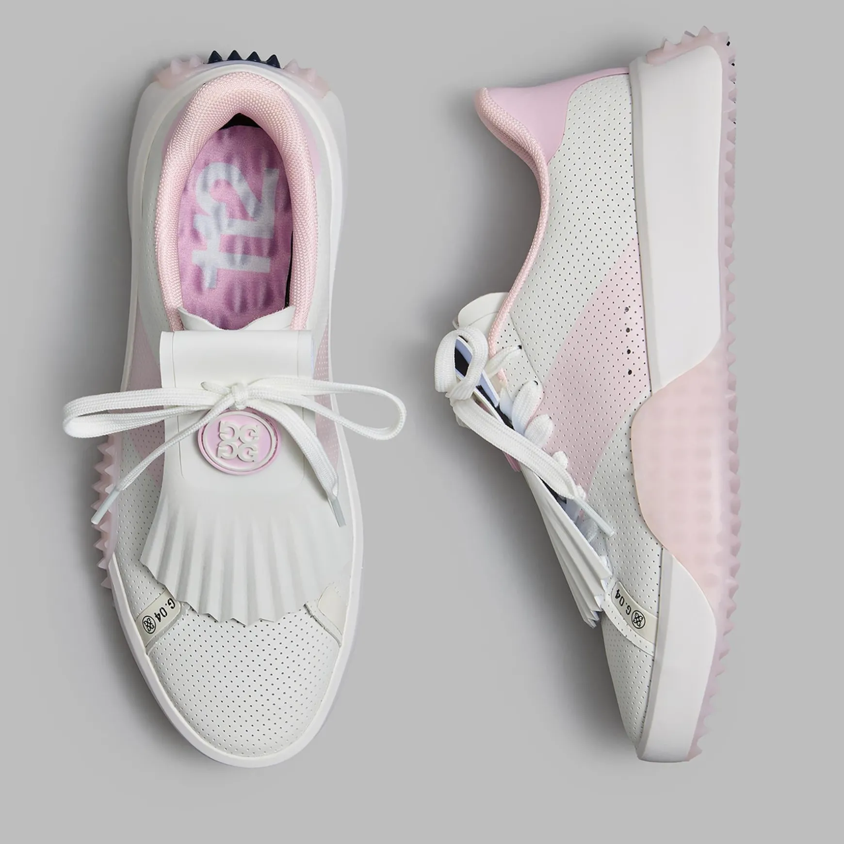 The G/FORE Women’s G.112 Perforated Kiltie Golf Shoes in Snow/Blush offer a perfect blend of style, comfort, and performance. With a sleek silhouette and low-drop design, these shoes are engineered to enhance ground feel and stability for optimal play. Made with waterproof PU leather and a seamless synthetic upper, they provide durability and protection against the elements. The perforated saddle stripe design adds a touch of elegance, while the EVA midsole and heel-to-toe turf traction ensure unmatched comfort and grip. Whether on the course or in the clubhouse, these shoes make a statement with their modern style and functionality.