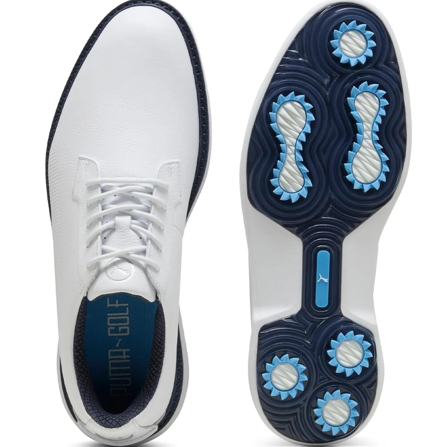 Designed for serious golfers, the Puma Royale Golf Shoes in Puma White/Deep Navy/Team Light Blue combine premium craftsmanship with cutting-edge performance features. Constructed with a full-grain leather upper, these shoes offer classic style with modern durability, while the PROFOAM midsole provides superior cushioning and responsiveness for all-day comfort. The FLEXSPIKE outsole delivers exceptional grip and stability, ensuring a strong foundation for every swing. With a stitched performance TPU welt and PROMOLD sockliner, these shoes provide a secure, cushioned fit, making them the ultimate blend of style and function on the course.