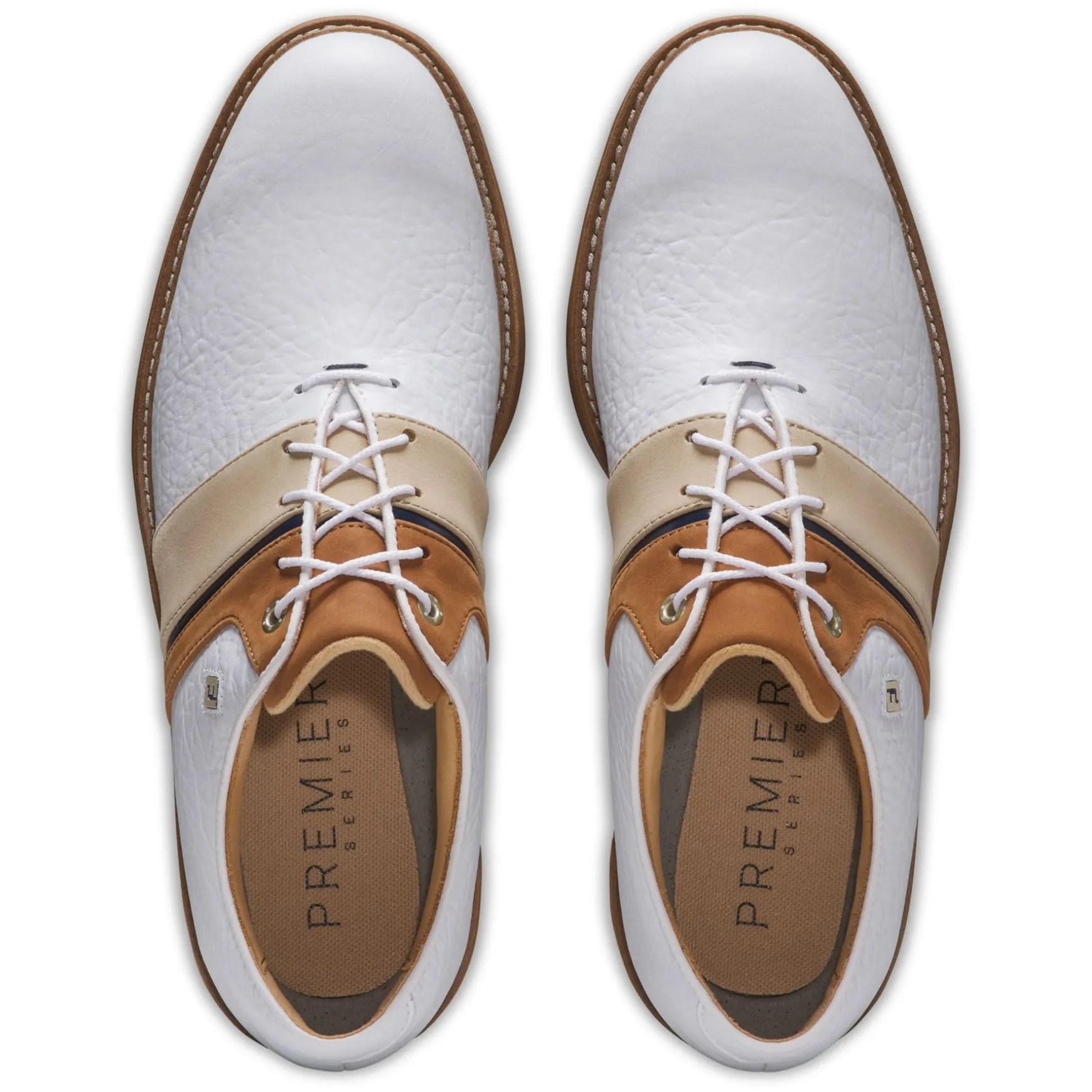 The FootJoy Premiere Series Packard LX Golf Shoes in White/Blue/Brown blend sophisticated design with high-performance features, making them an essential addition to any golfer’s wardrobe. Constructed from premium full-grain leather and enhanced with LifeShield Waterproof technology, these shoes deliver durability, comfort, and all-weather protection. With advanced cushioning and grip technology, the Packard LX ensures peak performance and stylish versatility on and off the course.