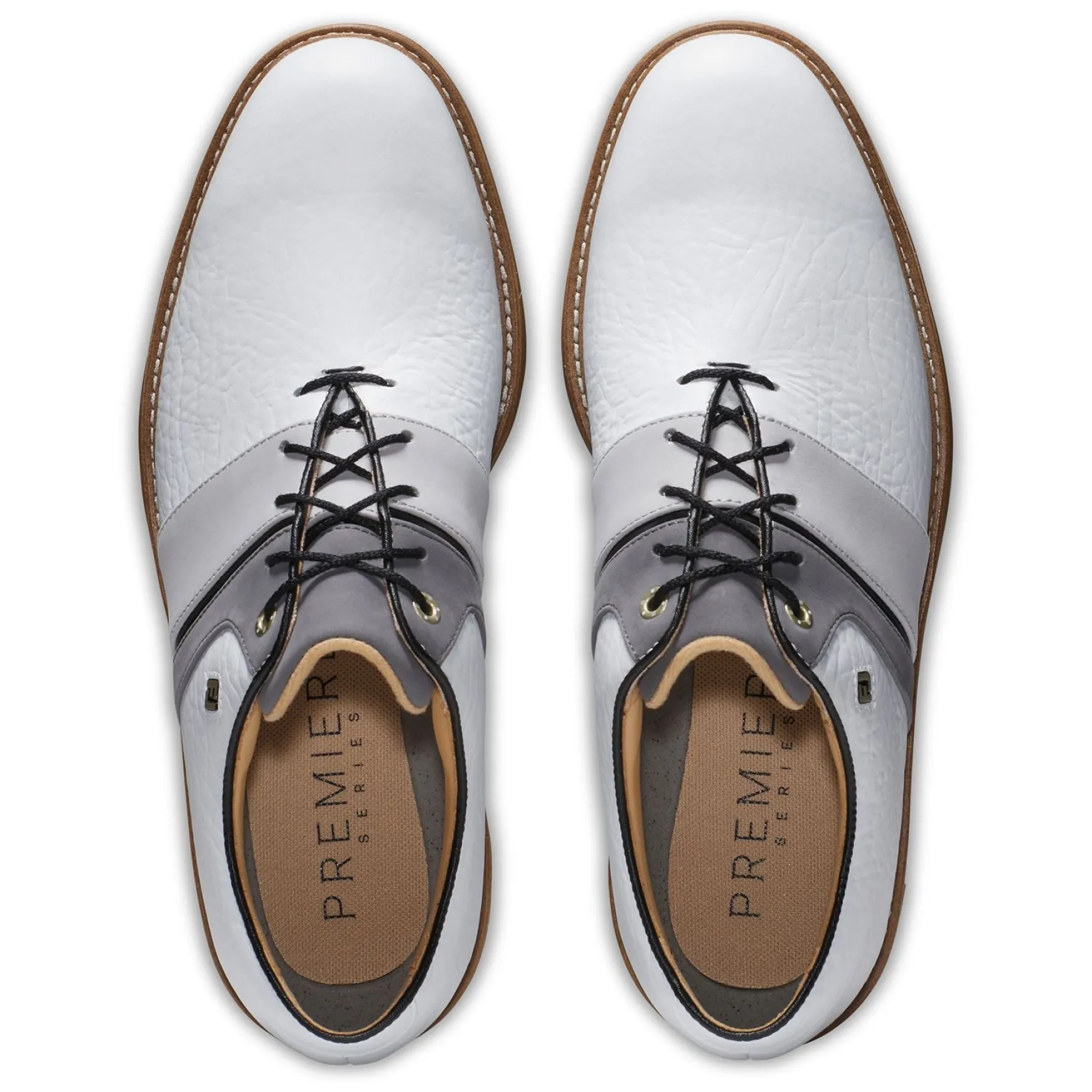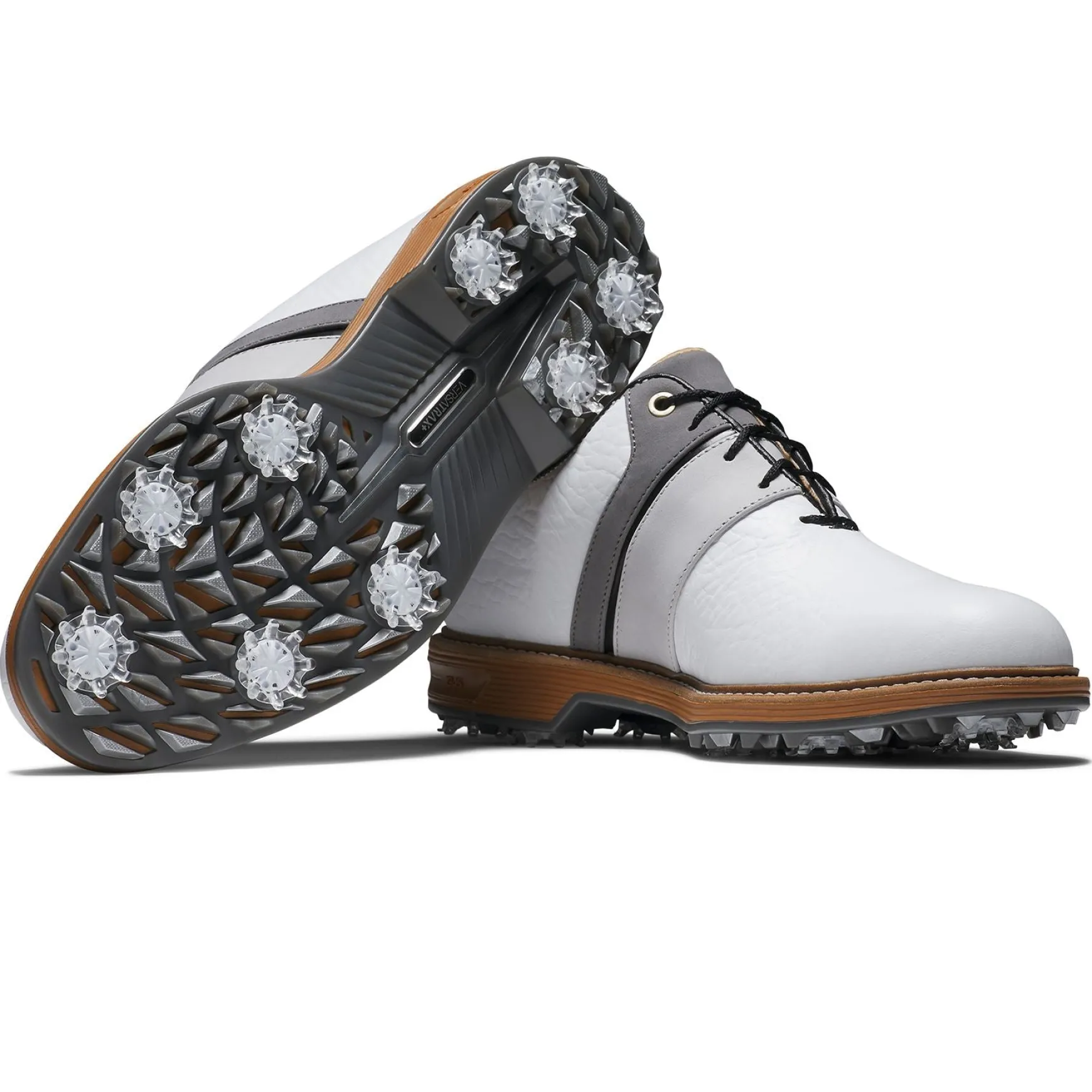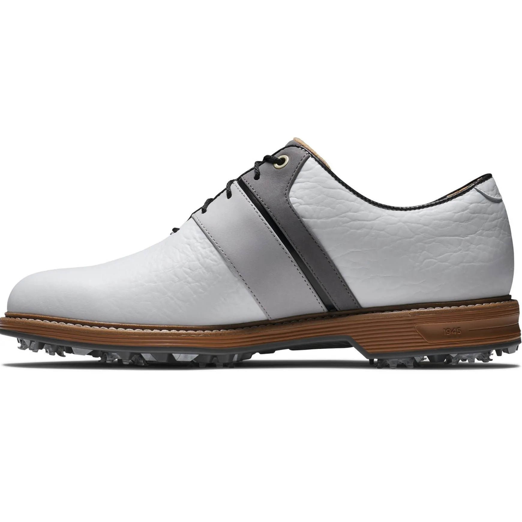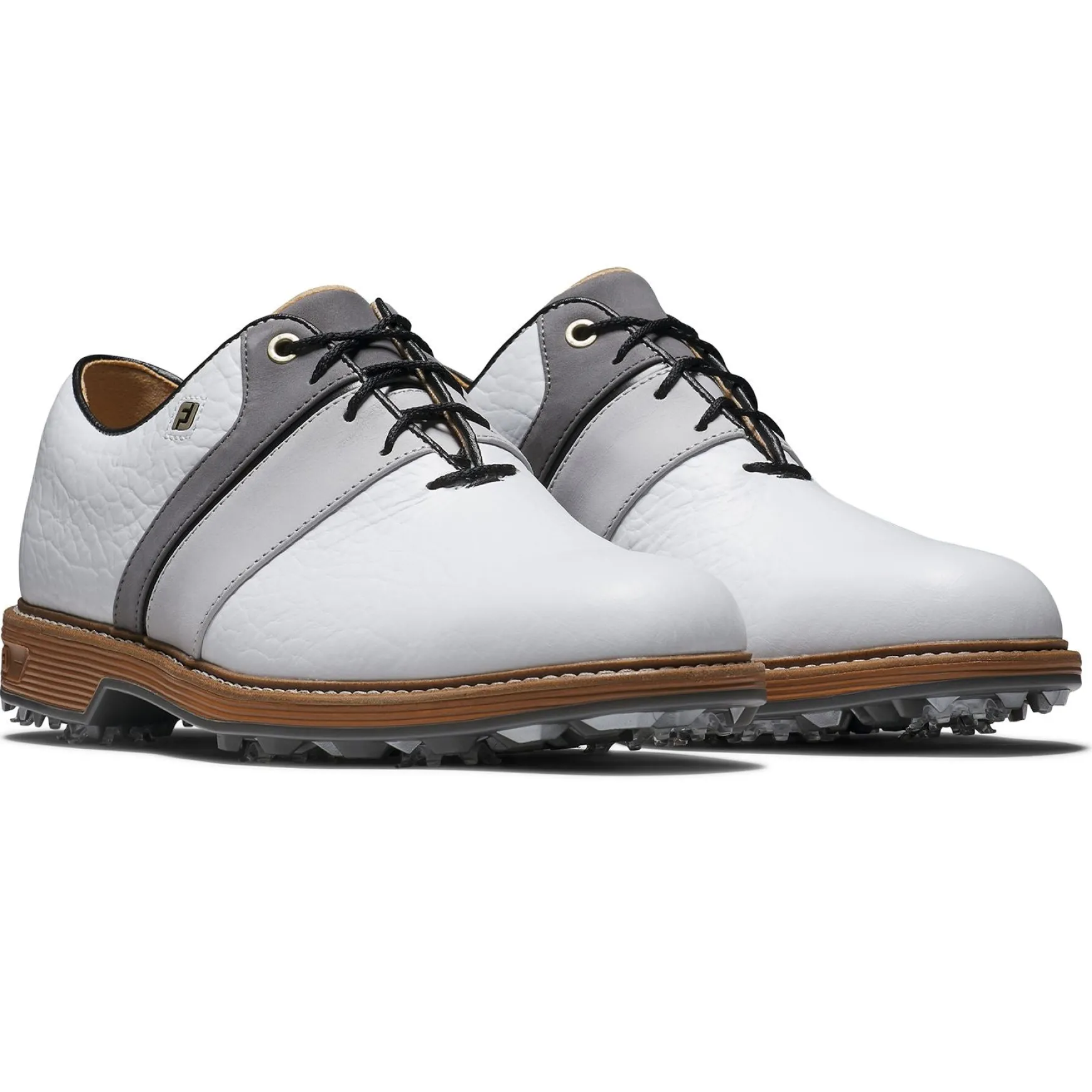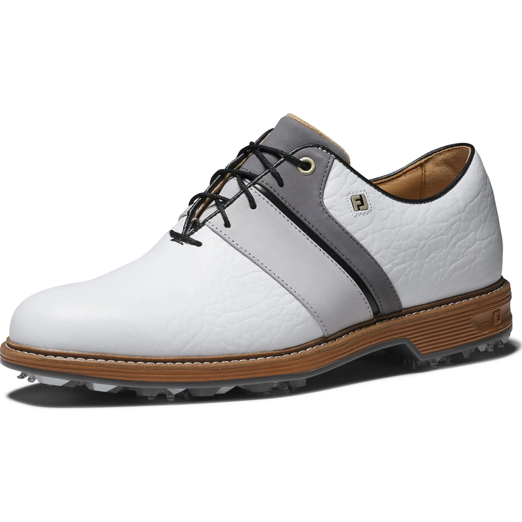 The FootJoy Premiere Series Packard LX Golf Shoes in White/Grey/Black combine elegant style with exceptional performance features, making them a standout choice for golfers. Crafted from premium full-grain leather with LifeShield Waterproof technology, these shoes offer unmatched durability and weather resistance. With enhanced cushioning, superior traction, and luxurious detailing, the Packard LX is designed to deliver all-day comfort and style on the course.